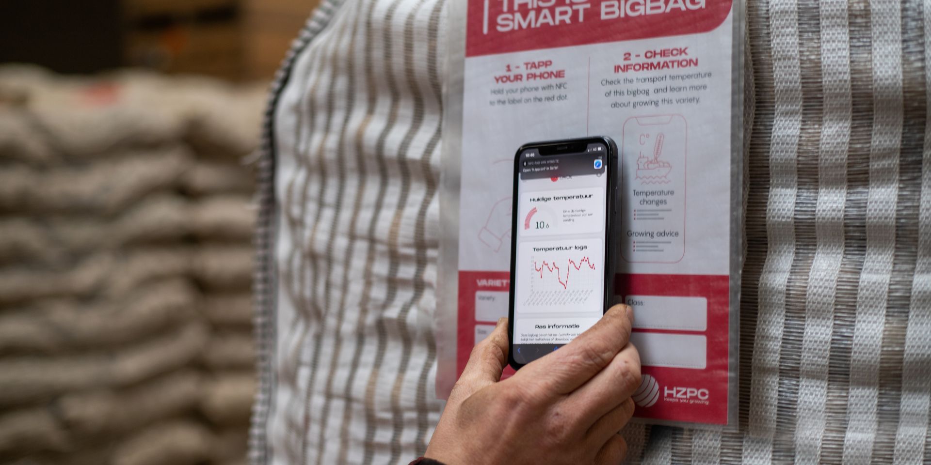 Nieuw in de pilot is dat 100 van deze bigbags een slim label hebben dat tevens is uitgerust met een temperatuursensor. Als partijen pootgoed onderweg zijn, kunnen schommelingen in de temperatuur de kwaliteit van de aardappelen beïnvloeden. Voor HZPC is het interessant te weten hoe de condities tijdens het transport zijn, om eventuele klachten over het pootgoed later beter te herleiden. Na de eerste bigbagproef werd daarom aan ontwikkelaar Niels Postma van Tapp.online gevraagd of het mogelijk is om ook temperatuursensoren te integreren in de slimme labels. Hij ging ermee aan de slag en kreeg het voor elkaar om naast de NFC-chip (near field communication) in het papier ook een micro-sensor te verwerken die temperaturen uitleest.